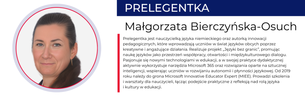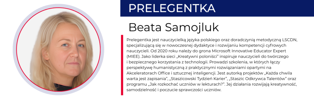 - Akceleratory Nauki i moduł Teach w Microsoft 365 – bezpieczna i świadoma transformacja edukacji. Magdalena Nowosielska, Małgorzata Bierczyńska-Osuch, Beata Samojluk